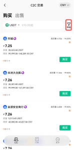 打开欧易 APP首页,点击【C2C买币】—【订单】— 选择查看【未完成/已完成/已取消】订单。点击第二图右上角图标,可以进行【订单筛选】。