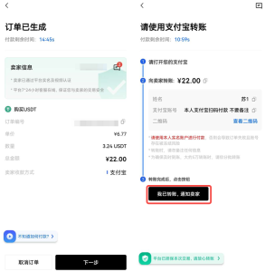 订单确认之后,点击【下一步】;及时打开手机银行APP/支付宝/微信,输入对方账户信息进行付款,完成之后,点击【我已转账,通知卖家】。对方核实款项后,您所购买的数字资产就会发放给您,可以在【资产】栏查看。